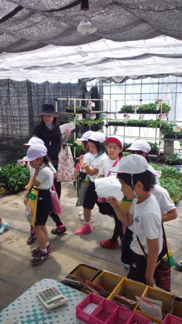 先週の阪合部保育所の園児の来訪(来襲)に続いて、阪合部小学校の児童が『ちくたんけん』の一環で、我が小羽根種苗園の売店にやって来た。
